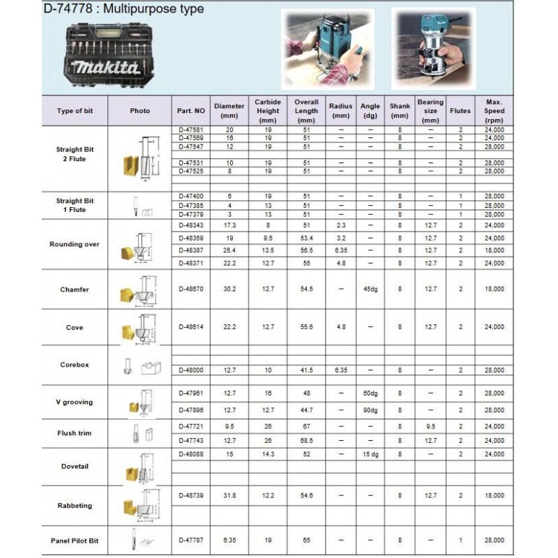 MAKITA D-74778 sada frézek 8mm 22ks po zanořovací a jednoruční frézy