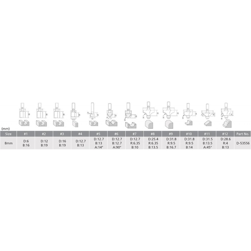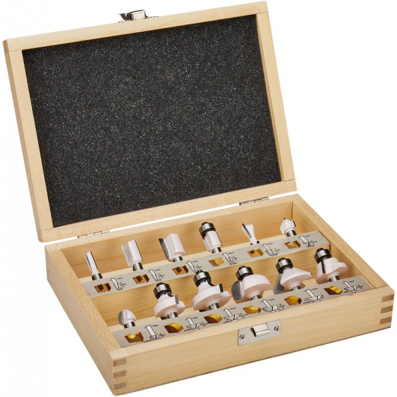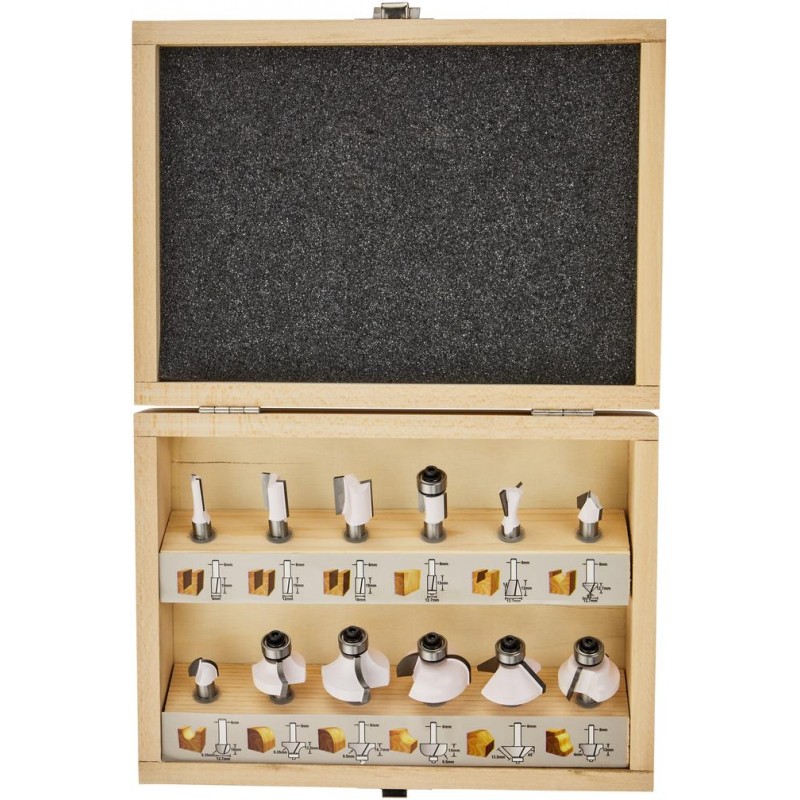 12dílná sada fréz s průměrem stopky 6 mm v dřevěné krabičce. 12dílná sada frézovacích bitů je ideální pro dřevaře. Sada obsahuje: 1x kopírovací fréza s ložiskem o průměru 12,7 mm a délce 13 mm, 1x drážkovací fréza o průměru 6 milimetrů o délce 19 milimetrů., 1x drážkovací fréza o průměru 12 milimetrů o délce 32 milimetrů. 1x drážkovací fréza o průměru 14 milimetrů o délce 19 milimetrů, 1x ořezávač hran o průměru 32 milimetrů o délce 20 milimetrů, 1x hranová fréza o průměru 22,2 milimetrů a poloměru 6,3 milimetrů, 1x ořezávač hran o průměru 28,6 milimetrů a poloměru 9,5 milimetrů, 1x fréza na srážení hran o průměru 32 mm a poloměru 45 stupň, 1x fréza na drážky do V o průměru 12,7 milimetrů o délce 12 milimetrů, 1 X Dutá profilová fréza o průměru 12,7 milimetrů a poloměru 6,35 milimetrů, 1x římská fréza o průměru 25 milimetrů s rádiusem 4 milimetry, 1x profilová fréza o průměru 22 milimetrů s rádiusem 6,3 milimetrů. Frézy mají stopku 6 milimetrů. Díky tomu se frézy hodí na jakoukoli značku (horní) frézy s 6 milimetrovým sáním. V kombinaci s adaptérem lze frézy použít i ve frézách s 8, 10 nebo 12 milimetrovým sklíčidlem. Adaptéry nejsou součástí této sady routeru. Dodáváno v robustním dřevěném kufru.